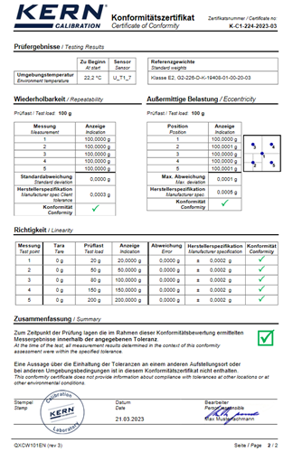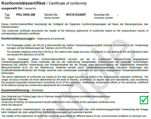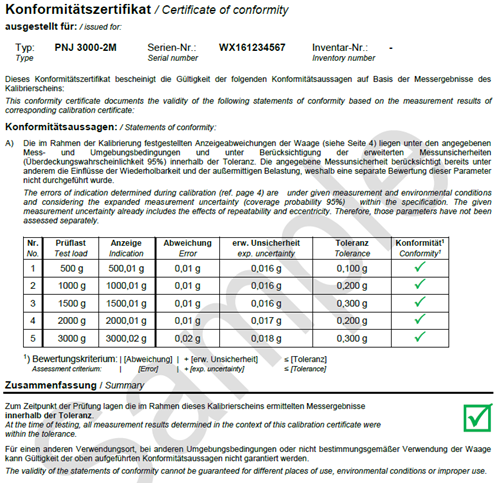 Das hier gezeigte Konformitätszertifikat trifft eine Aussage zu diesen einzelnen Messergebnissen, bevor diese in die Gesamtmessunsicherheit einfließen. Dies erlaubt es z.B. Herstellerangaben abzuprüfen, jedoch keine gesamte Aussage über die Messunsicherheit künftiger Einwaagen.
