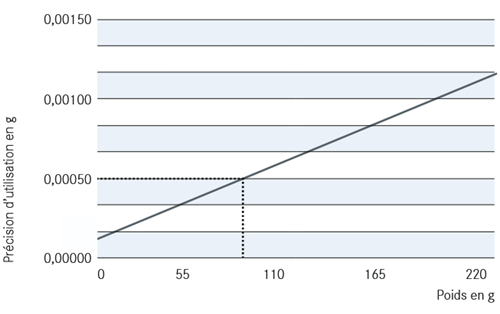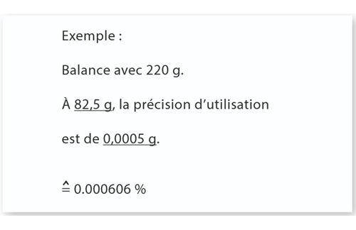 En supposant que les conditions environnementales (par exemple, courants d'air, vibrations, etc.) soient les mêmes que celles qui prévalaient au moment de l'étalonnage sur le lieu d'installation de la balance et en estimant les variations de température ambiante à X Kelvin (°C) avec un coefficient de température attribué à la balance (X•10-6 / K), on obtient une certaine précision d'utilisation. Cette précision d'utilisation est déterminée conformément à la norme EURAMET cg-18.